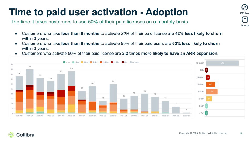 - Time to Paid User Activation (Adoption) — Customers activating users earlier were significantly less likely to churn