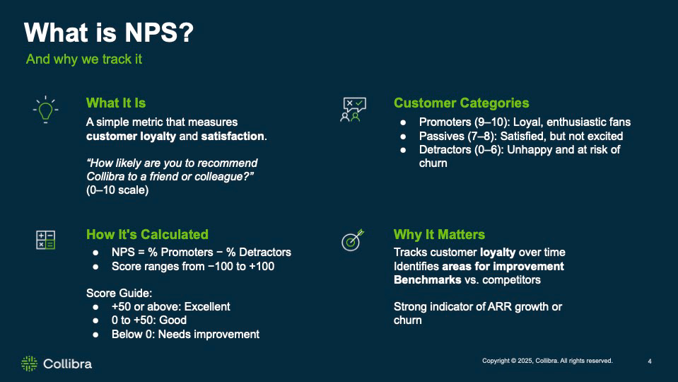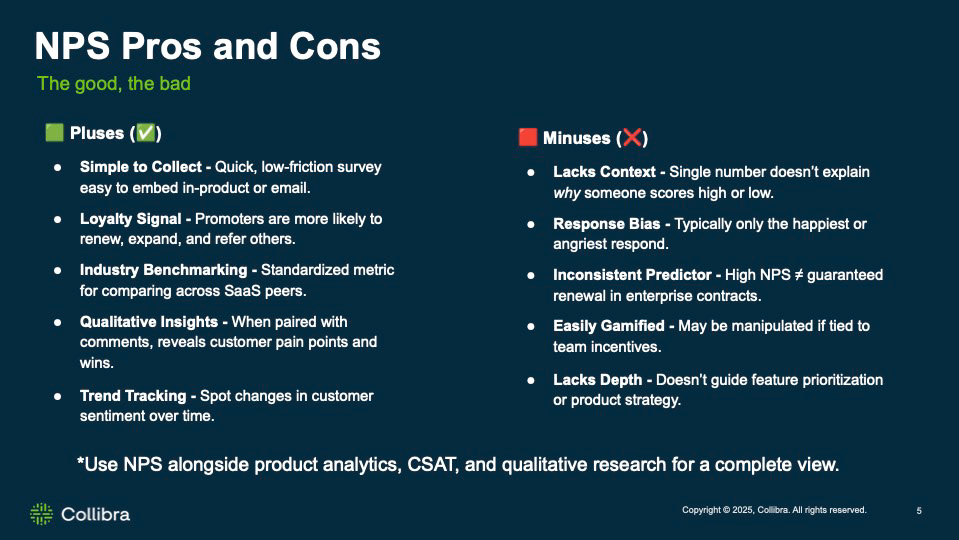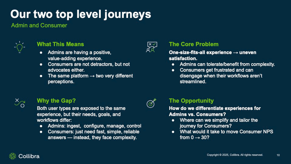 At Collibra, I led the use of NPS as a strategic UX signal to guide platform roadmap decisions. By segmenting NPS by user type and pairing sentiment with journey analytics and time-to-value metrics, we uncovered a critical gap: Admins were satisfied and renewing, while Consumers were neutral, limiting adoption and expansion. These insights reframed UX priorities around differentiating Admin and Consumer experiences, reducing complexity, and accelerating time to value — directly connecting UX improvements to activation, retention, and ARR growth.