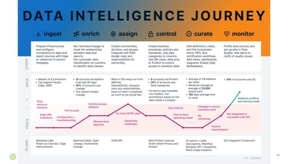 Collibra serves complex enterprise customers managing governance, privacy, and trust across massive data ecosystems. The platform spans multiple personas — from data stewards and engineers to compliance leaders and executives — each with distinct mental models and success metrics.